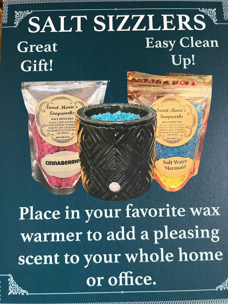 What are Salt Sizzlers? Not only are Salt Sizzlers a versatile, economical and BEAUTIFUL replacement for wax tarts and candles. They have easy clean up!! Place Salt Sizzlers in your favorite wax warmer or vented car jar and enjoy your favorite scent for days, rather than just hours. No need to add water. And easy clean up! When you want to change scents you just dump out in the trash. No worries of hot melted wax spilling!